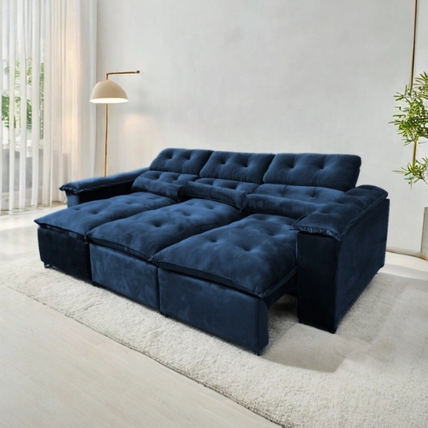 Em até 1x de R$ 788,08 sem jurosEm até 12x de R$ 115,66 com juros À vistaR$ 669,87Exclusivo no Pix Sofá Retrátil 3 Lugares 2,10m York Suede Marrom
