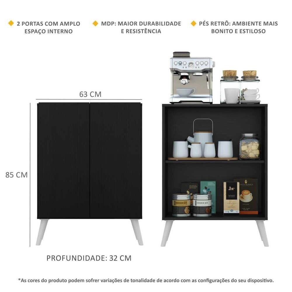 O Aparador Cantinho do Café com Pés Retrô e 2 Portas Multimóveis é produzido em mdp com acabamento acetinado (cerca de 20% de brilho), que garante maior durabilidade, facilidade na limpeza, além de um acabamento superior. Com 2 portas, possui um excelente espaço interno para organizar louças, bebidas e demais objetos (a prateleira interna suporta 8 Kg e o tampo 9 Kg). Os pés retrô, em polipropileno, dão um charme especial ao móvel deixando-o com um visual leve e permitindo você compor um ambiente com ar vintage e moderno ao mesmo tempo. Os amantes de café poderão deixar seu cantinho mais charmoso e prático para curtir os melhores momentos com os amigos e família, saboreando um delicioso cafezinho.