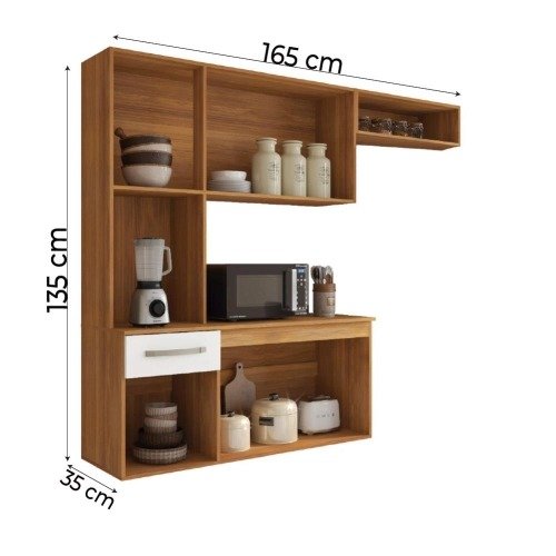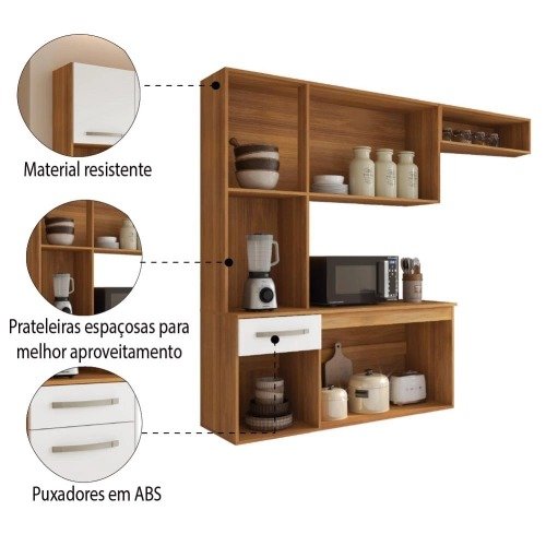 O Armário de Cozinha Completa Suspenso Belíssima traz qualidade, elegância e praticidade para o seu dia a dia. Contém 6 portas com prateleiras bem divididas para melhor aproveitamento do espaço, armário aéreo com nicho organizador, puxadores modernos e balcão com tampo que se torna uma excelente bancada para acomodar seus utensílios de cozinha. Com muita funcionalidade, vai deixar seu lar ainda mais bonito.