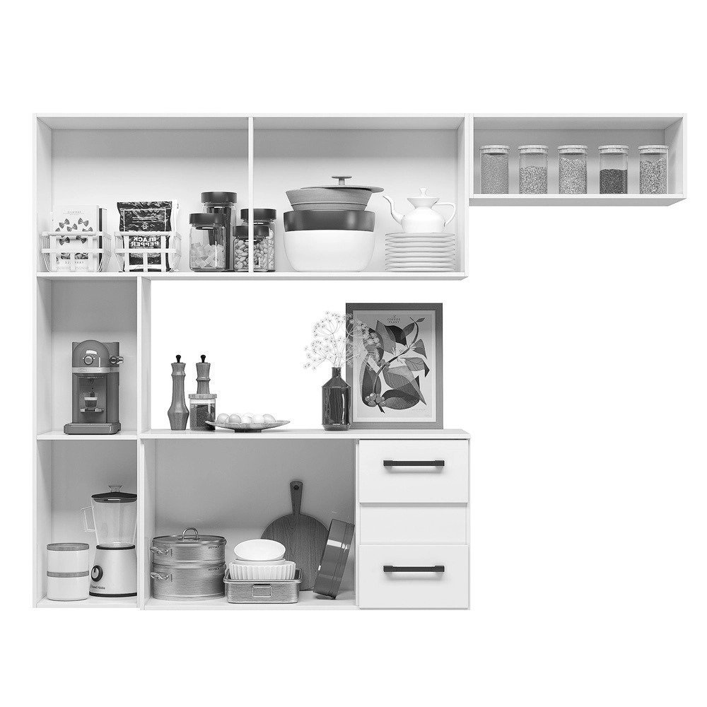 Nao importa se voce tem uma cozinha pequena, pois por ser um modelo de cozinha suspensa ela e perfeita para a otimizacao do espaco de circulacao e ainda facilita na hora da limpeza. Alem disso, possui otima divisao interna, o que contribui para dispor cada objeto em seu devido lugar. Sem contar que voce podera apostar em itens decorativos sobre o balcao com tampo ou ate mesmo deixar os eletrodomesticos a vista. Ai, vai do seu gosto e imaginacao.