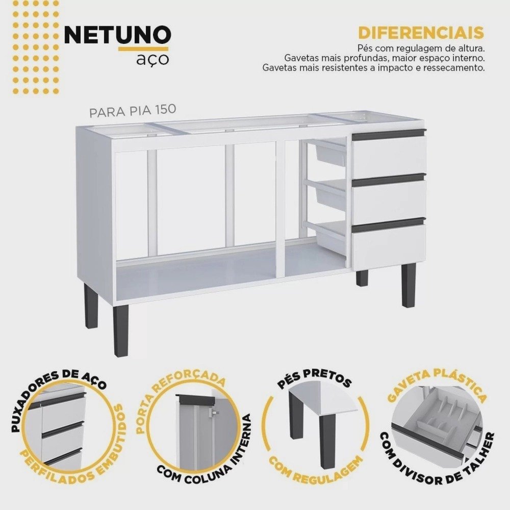 A linha de gabinetes para cozinha Netuno da Cozimax, é fabricada com chapas de aço eletrogalvanizado, que garante maior durabilidade e praticidade de limpeza no dia-a-dia, possui amplo espaço interno, uma gaveta plástica com divisor de talheres e outras duas gavetas para organizar objetos, puxadores exclusivos em perfil de aço e pés na cor preta com regulagem de altura.