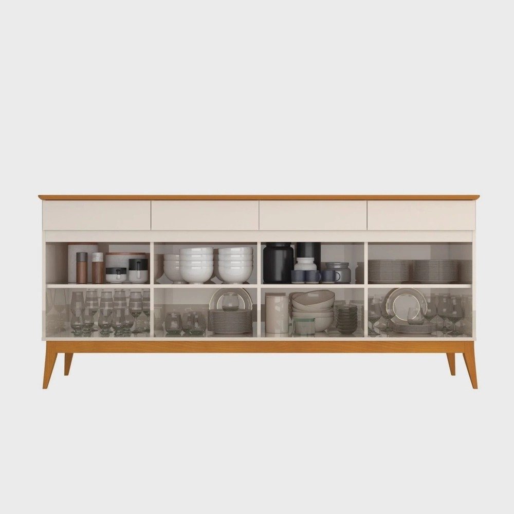 Informações Complementares (Novo Buffet com amplo espaço interno, 4 gavetas com corrediças telescópicas, 4 nichos, 4 prateleiras móvel, tampo fresado de 18mm, puxadores em cava, 6 pés em madeira maciça. Design contemporaneo. Acomoda utensilios de cozinha, objetos decorativos e outros.