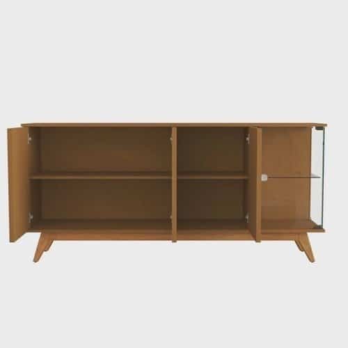 Moderno Buffet Ripado com porta, lateral e prateleira em vidro temperado 4mm, pés e travessas em madeira maciça.