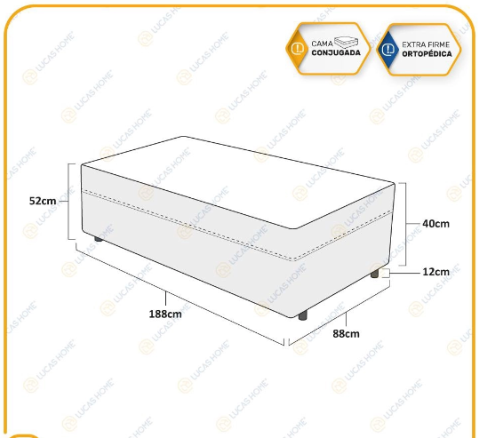Sejam bem-vindos (as) a lucas home, se você está pensando em praticidade, qualidade e economia a Lucas Home criou a Conjugada Ortopédica Unique. Uma cama ortopédica que oferece a firmeza e o conforto necessário para a sua saúde. Elaborada com materiais de excelente qualidade e cuidadosamente selecionados, sua estrutura é composta por madeira de Eucalipto, garantindo maior durabilidade e segurança. Fabricada com lâmina de espuma D28 de alta qualidade, ela proporciona conforto extra firme e suporte para sua coluna. Especificações Técnicas: – Colchão Fixo Conjugado de Espuma D28 – Proteções: Anti-ácaro – Anti-alérgico – Anti-fungo – Tipo de colchão: Espuma D28 – Tipo de conforto: Extra Firme – Peso máximo recomendado: até 100 Kg: – Altura dos pés: 12 cm; – Garantia: 03 meses; – Dimensões do produto (largura x comprimento x altura): Solteiro 88x188x52cm; * Indicada para quem gosta ou necessita de suporte firme para a coluna. importante: imagens meramente ilustrativas. (a lucas home não trabalha com móveis planejados. Podendo haver pequenas variações nas medidas e cores do produto/A cor do produto poderá variar de acordo com a tela de visualização/Os enfeites, eletrônicos e decoração não acompanham). **A lucas home não disponibiliza no momento o serviço de montagem, sendo de total responsabilidade do comprador. A lucas home Recomenda que a montagem seja feita por um profissional da área. **ATENÇÃO: Verifique se as dimensões dos produtos passam por elevadores, portas, escadas e corredores. A lucas home Não se responsabiliza pelo transporte dos produtos por escadas, guinchos, içamentos ou quaisquer outros meios específicos de transporte.