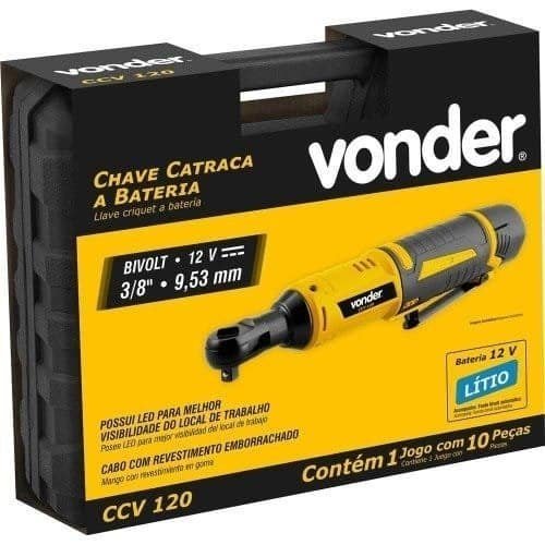 1 Chave catraca a bateria. Acompanha: 1 maleta plástica, 1 bateria 12 v, 1 fonte bivolt automático e 6 soquetes sextavados encaixe 3/8″ em cromo vanádio (10 mm, 11 mm, 12 mm, 13 mm, 14 mm e 17 mm).