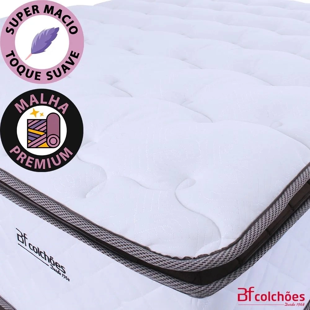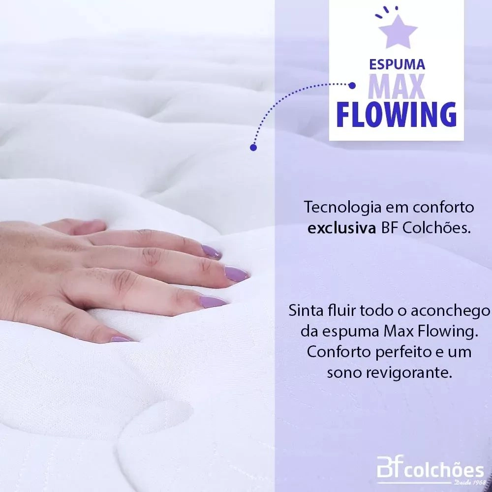 – Pillow top: Com camada de Espuma Max Flowing, tecnologia em conforto exclusiva bf Colchões, sinta fluir todo aconchego da espuma Max Flowing. Conforto perfeito e um sono revigorante.