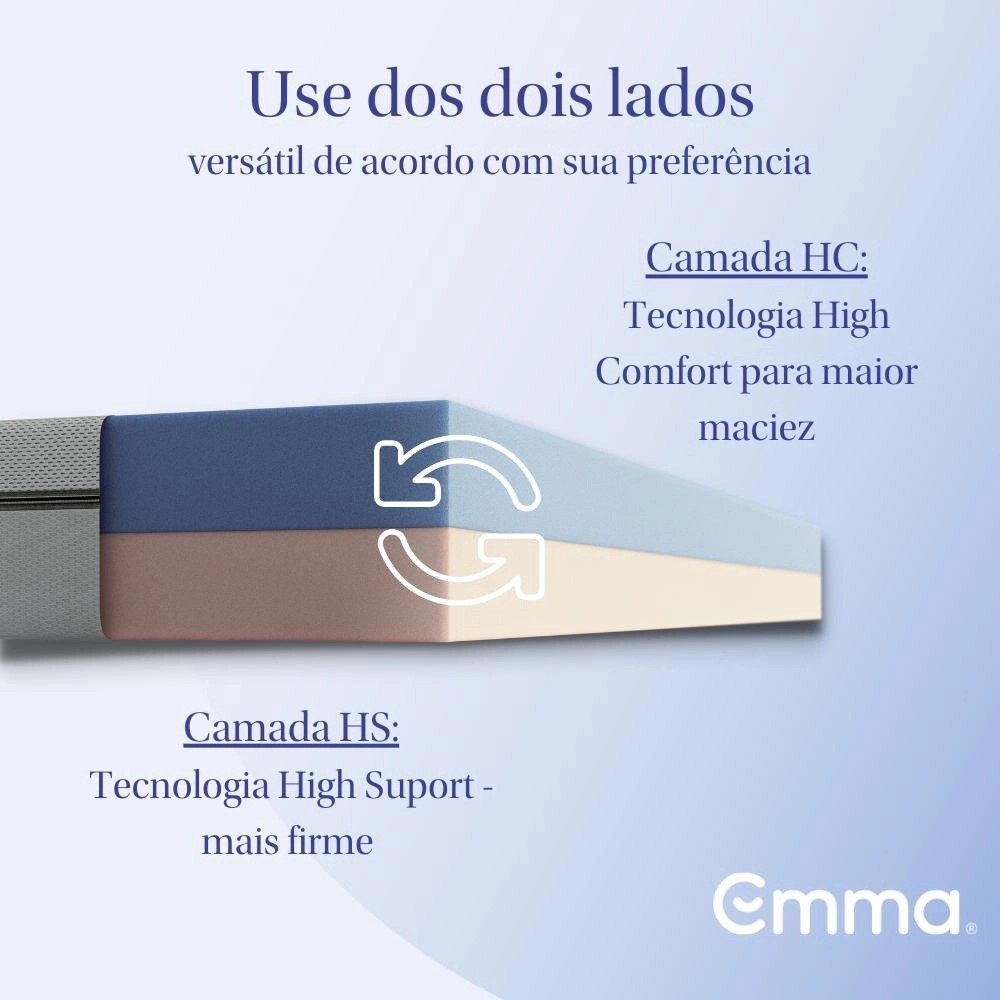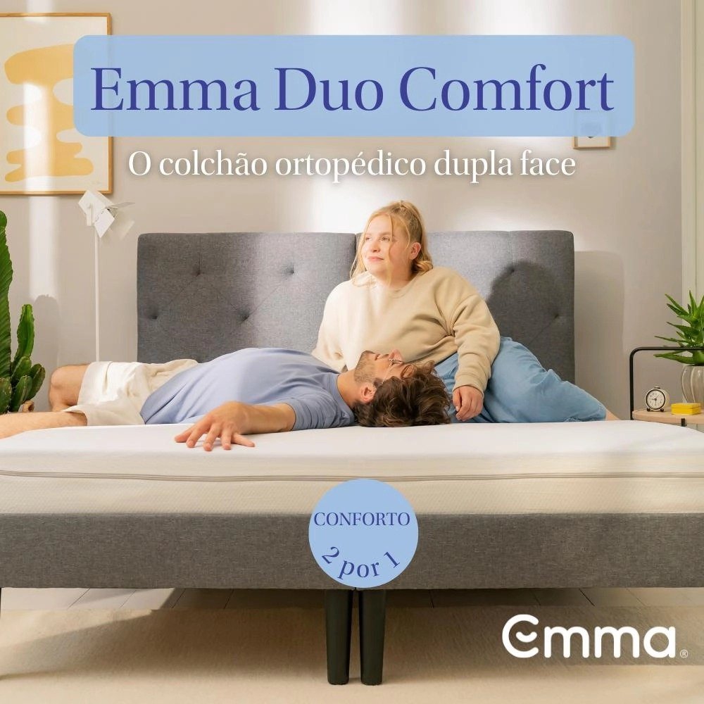 Dupla Face: O colchão Emma Duo tem a tecnologia dupla face, de um lado o mais macio proporcionando o Alto conforto, do outro o mais firme proporcionando o Suporte, ideal para quem tem dores nas costas e busca um produto ortopédico. Conforto a noite toda: A combinação das camadas do Emma Duo oferecem uma sensação duradoura de conforto, suporte e relaxamento, independentemente do lado escolhido. 10 anos de garantia: Devido a sua composição de materiais de alta durabilidade, certificados através de teste laboratório DIN-Spec. Experimente 100 noites na sua casa: Oferecemos 100 noites para você experimentar o colchão no conforto do seu quarto. Caso não esteja satisfeito, a devolução é simples e à domicílio. Conforto ortopédico: Independente do seu lado de preferência, a densidade do Emma Duo contribui para a melhor postura corporal.. Evita dores nas costas: Devido à sua densidade progressiva, o Emma Duo é ideal para pessoas com dores nas costas, pois é firme e distribui o peso igualmente em toda a sua superfície. Capa Hipoalergênica lavável: O tecido de alta qualidade evita o acúmulo de ácaros e melhora a circulação de ar, portanto o seu colchão não esquenta demais no verão, garantindo noites frescas e confortáveis, além de ser indicado para quem possui alergias.