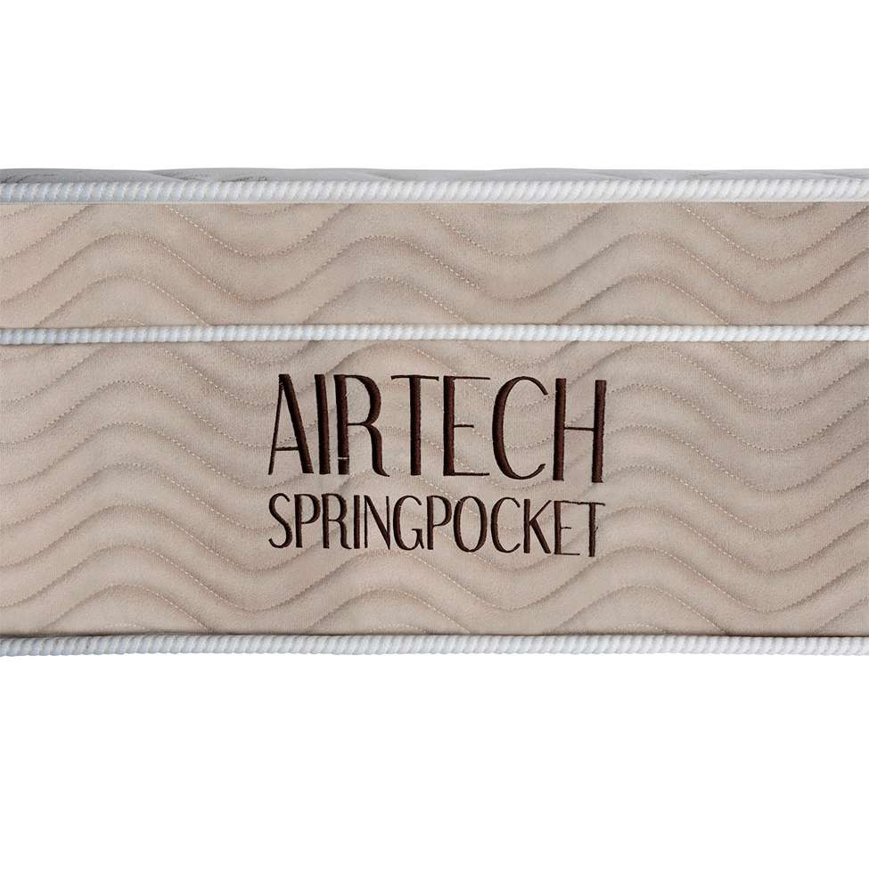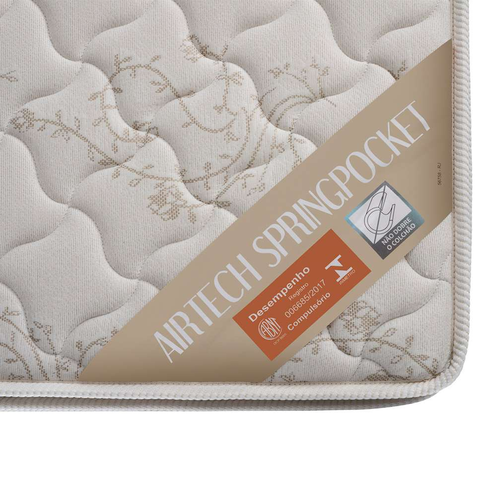 | Material6221 | O Colchão Airtech Spring possui estrutura em mola superpocket, enchimento em espuma D26, revestimento em malha (tampo) e camurça (lateral), bordado em matelassê, ortopillow e acabamento em debrum |
