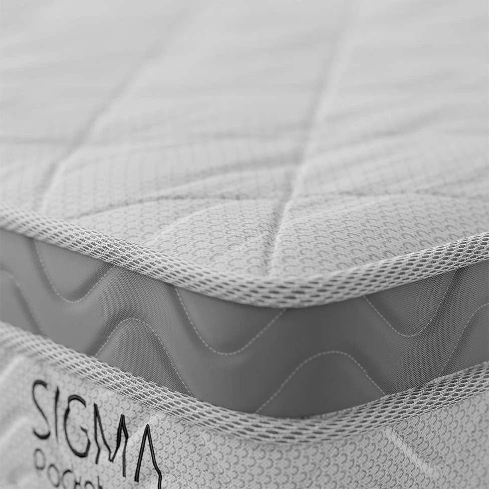 Material6221 O Colchão Sigma possui estrutura em molas ensacadas, espuma do tipo poliuretano com densidade D26, europillow, tampo em poliéster (superior e lateral) e fundo em tnt antiderrapante.