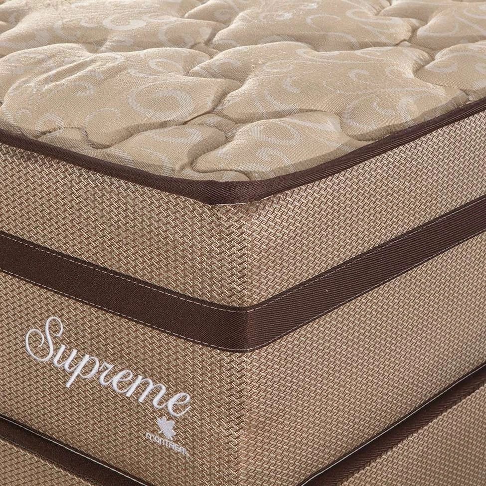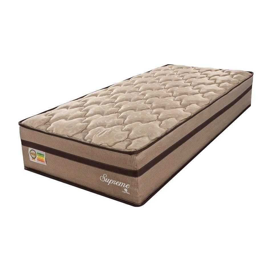 | Material6221 | Colchão Supreme é composto por molas ensacadas, espuma poliuretano densidade d28kg/m3, eps – Poliestireno Expandido, acabamento com linhas poliéster, revestido com faixa lateral e europillow no poliéster, tampo no tecido tipo malha jacquard e fundo do p |