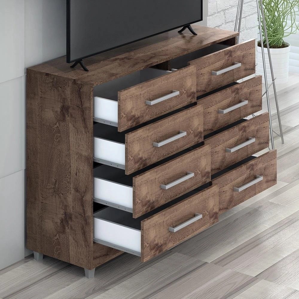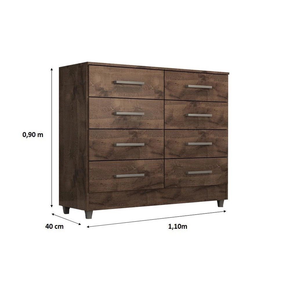 Cômoda raissa Com 8 gavetas dispõe de um design sofisticado é própria para pessoas exigentes com organização. As gavetas possuem corrediças metálicas, fazendo assim com que a gaveta não caia na hora que você for utilizar, evitando acidentes com crianças. O móvel suporta pesos de até 7kg em suas gavetas e 20kg no tampo suficiente para acomodar televisores, além disso acompanha pezinhos para melhor limpeza e durabilidade do produto. As gavetas são espaçosas e comportam um bom volume de roupas e acessórios em seu interior. Possui acabamento Touch Alto-Relevo ou Alto Brilho uv e Semibrilho parte interna. Tem um design moderno que ao mesmo tempo atende muito bem as reais necessidades de uma ou duas pessoas. Além desses detalhes é de fácil montagem. Altura 0,90m x Largura 1,10m x Profundidade 0,40m x Peso 37kg