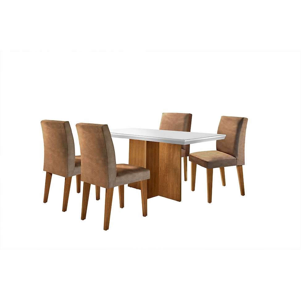 | Material6221 | Estrutura da Mesa em mdf 15 mm; Base em mdf 15 mm; Tampo em mdf 15 mm e Vidro Serigrafado Temperado 4 mm; Cadeiras em mdf 15 mm; Enchimento em Espuma D23; Pés em mdf; Revestimento em Suede; Acabamento em Pintura Texturizada uv |