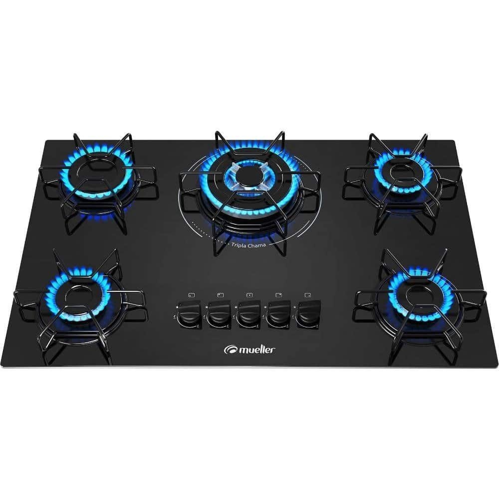 Com o Cooktop Mueller 5 bocas você tem muito mais segurança para cozinhar suas receitas favoritas. Com grades de aço esmaltado e 6 pontos de apoio, garantem mais estabilidade e segurança no encaixe das panelas Possui acendimento superautomático que garante mais agilidade no preparo dos alimentos. Seus queimadores em aço esmaltado e a mesa em vidro temperado facilitam sua limpeza. Ele ainda possui 01 queimador Tripla Chama de 3.600 Watts de potência, 01 queimador ultra chama de 2.400 Watts e 03 queimadores semirrápidos de 1700 watts de potência. Para cada um é indicado o tamanho ideal de panela.