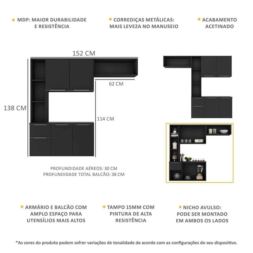 Altura: 138cm Largura: 152cm Profundidade: 30cm (aéreos) – 38cm (balcão com tampo)