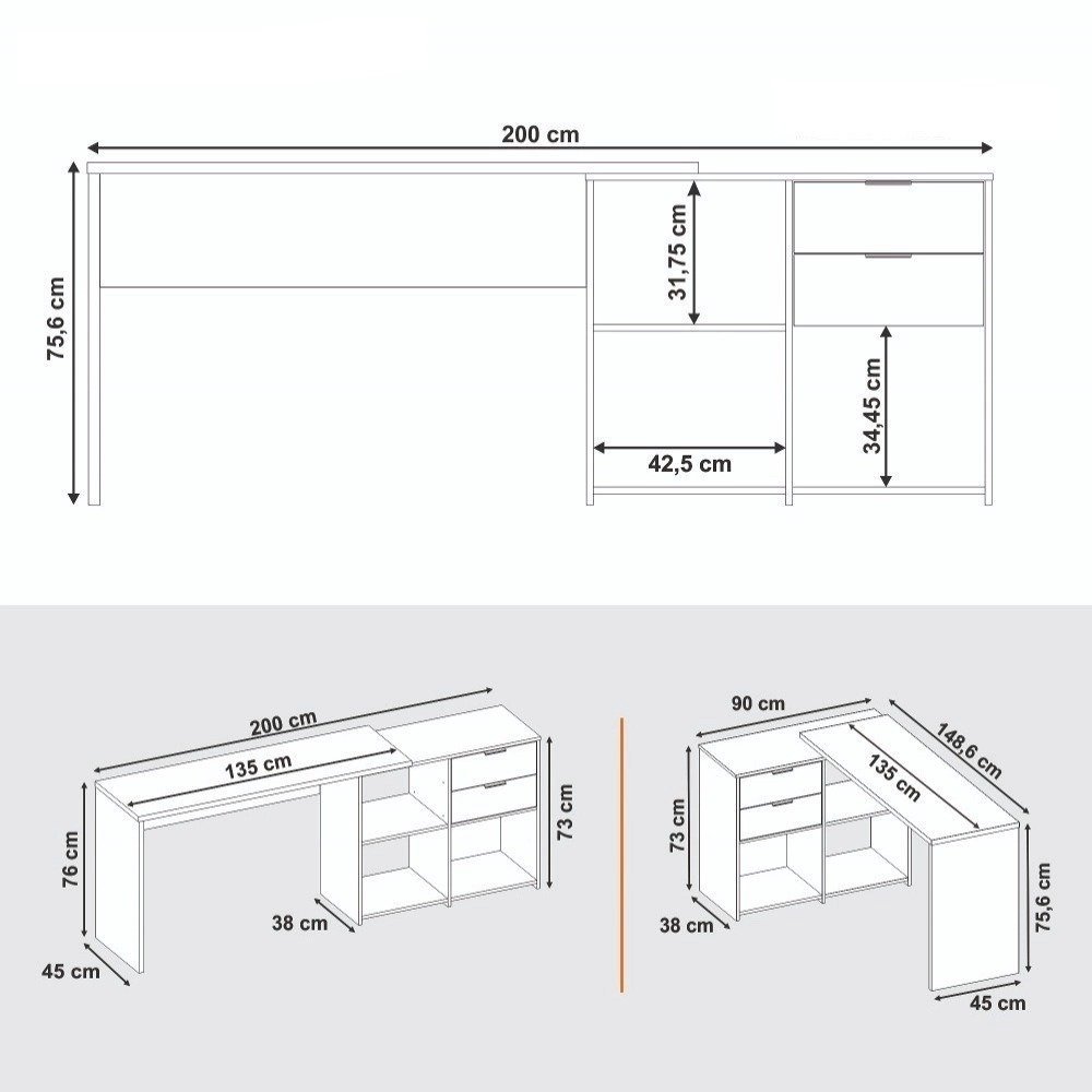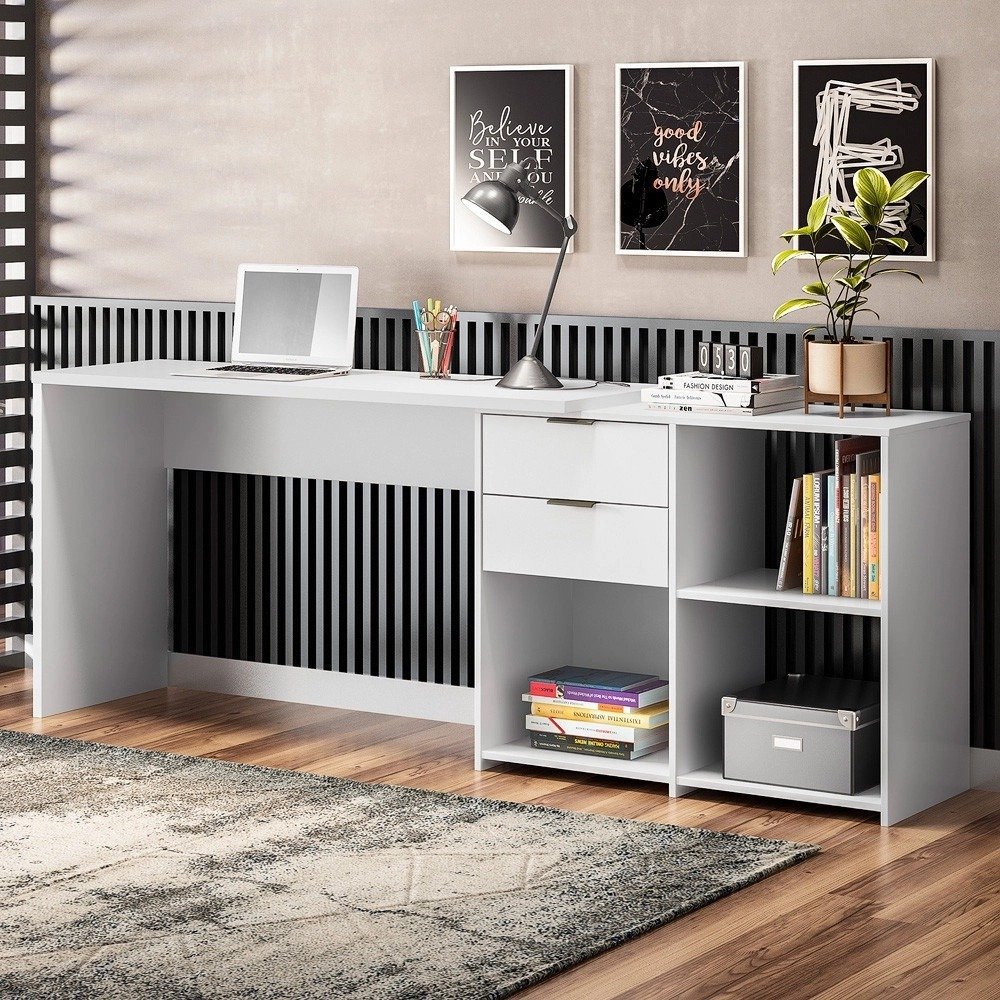 A Escrivaninha Office nt 2060 da Notável Móveis, é um móvel completo que vai te auxiliar nas atividades do home office ou estudos. Com ela, você tem diversas possibilidades de montagem: de canto, montada reta, com o nicho para o lado direito ou esquerdo e você também pode escolher em que lado colocar as gavetas! O tampo de 25 mm é super espaçoso para você organizar itens essenciais ao dia a dia, e as gavetas possuem corrediças metálicas para guardar documentos e demais objetos. Um móvel moderno que vai atender as suas necessidades!