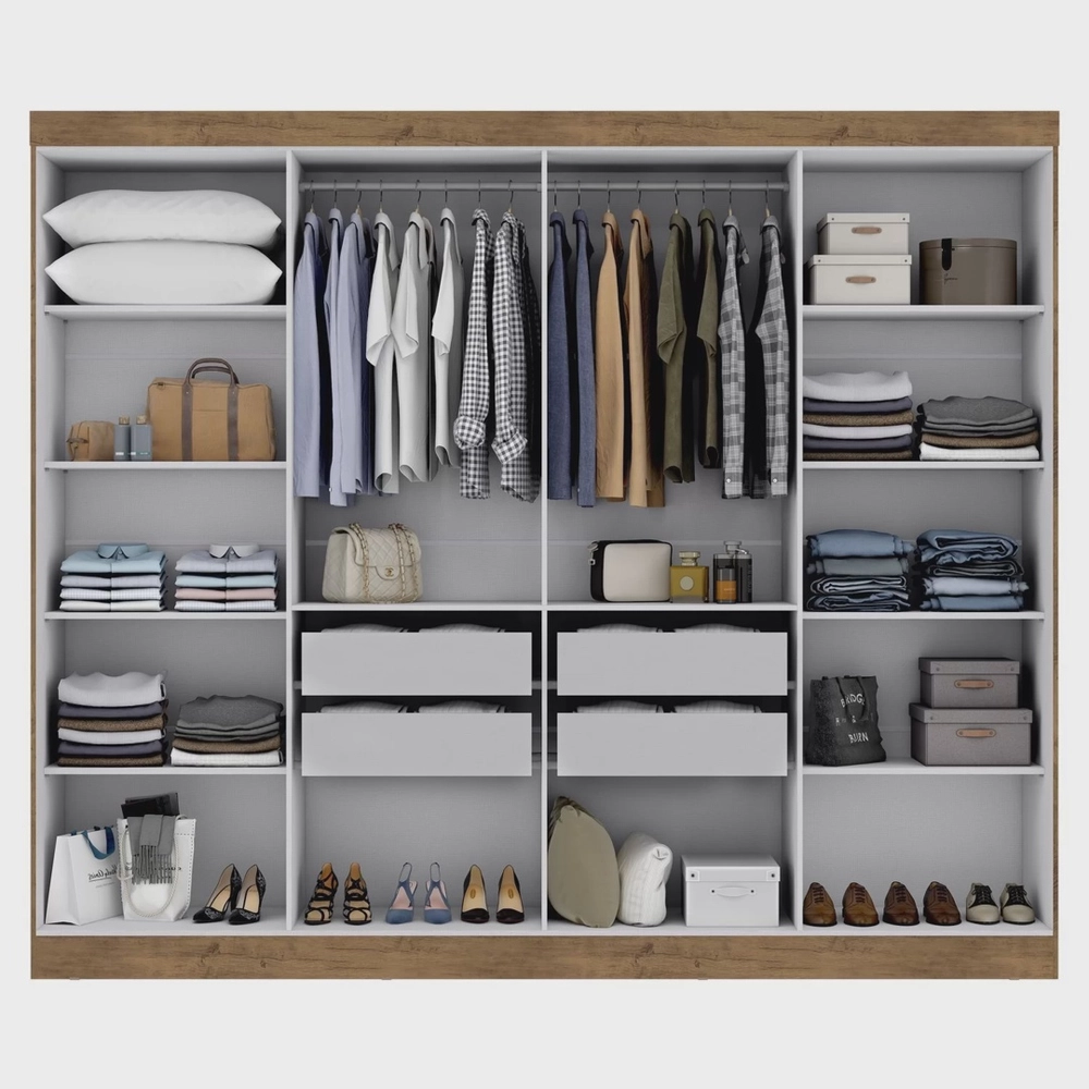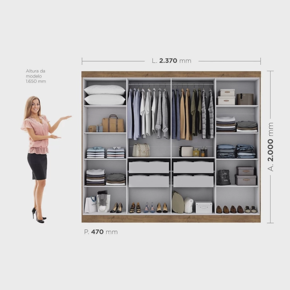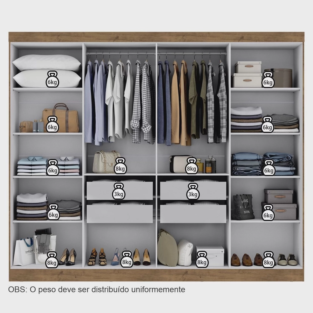 Durabilidade é a palavra para o guarda roupa Paris 8 portas, desenvolvido em material ecologicamente correto, o produto possui 8 portas de abrir com um amplo espaço interno, gavetas internas com corrediças metálicas, varão e calceiro em madeira.