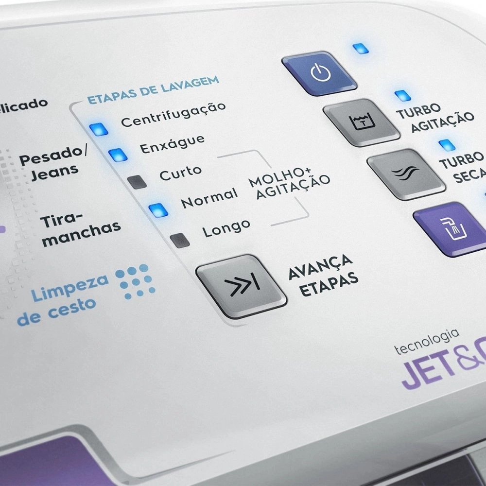 Turbo Agitação: Aumenta a velocidade da agitação melhorando o desempenho do cesto. Indicado para manchas mais difíceis ou roupas mais sujas