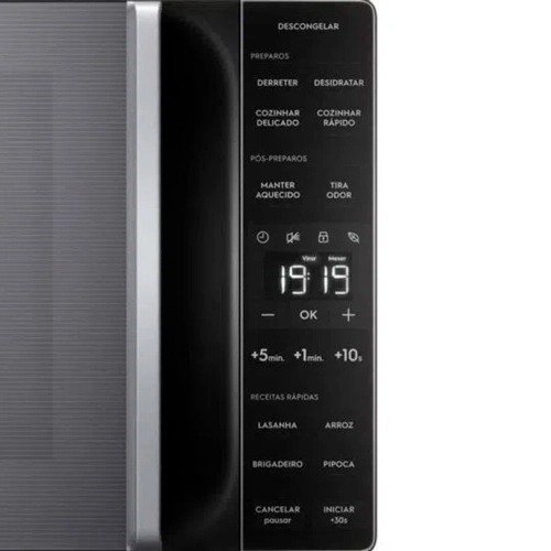 Diferenciais do Produto; Função – Descongelar; virar e mexer; Derreter; Desidratar; Cozinhar Delicado; Cozinhar Rápido; Manter Aquecido; Tira Odor; Cancela Pausa; Inicio + 30 + 5min; + 1min; + 10s; Relógio; Trava painel Eco mode; Mudo; Som