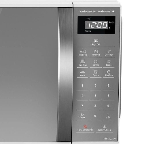 Traga mais tecnologia e praticidade para a sua cozinha. O micro ondas Panasonic ST27LWRU conta com tecnologia antibactéria Ag, que enibe a proriferação de bactérias. Seu interior possui o novo revestimento com camada de tinta com sistema antimicrobiano. Ele também tem revestimento antiaderente no seu interior, o que deixa 4x mais fácil de limpar quando comparado a outros modelos. Sabe quando você coloca uma tigela ou vasilia e a alsa fica virada para o fundo do forno? Com o sistema pega fácil, você consegue retirar o utensílio na mesma posição que você colocou. Isso porque, assim que termina o aquecimento o prato do micro ondas Panasonic faz uma rotação para que você pegue exatamente onde deixou. Com o desodorizador você pode esquecer o cheiro de uma receita enquanto prepara outra, pois ele suaviza os odores das refeições aquecidas anteriormente. Cor: Prata
