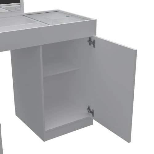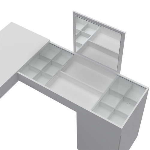 A Penteadeira Camarim Escrivaninha de Canto Estrela Branco da Mpozenato, vai te surpreender! é um móvel sofisticado e funcional, ela possui espelho e bancada com divisórias para organizar seus acessórios e maquiagens, nessa bancada tem 2 tampos de vidro deslizantes, conta com estrutura em mdp e pintura em uv invernizado garantindo maior durabilidade ao produto. Ah, e o legal desse produto é que ele também pode ser utilizada como escrivaninha, pois tem uma bancada ampla ao lado, além disso, conta com excelente espaço interno.
