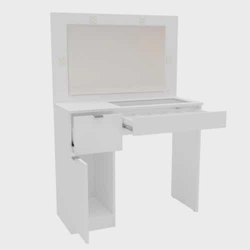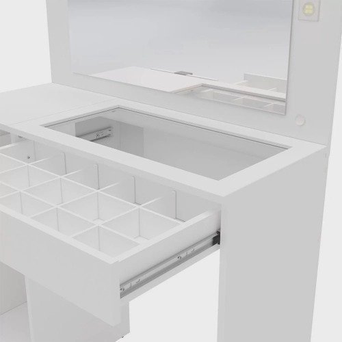 A penteadeira Bahia vai deixar você e a sua casa muito mais lindas, sabe por quê? O design dela, de cara, já deixa tudo ao seu redor mais bonito e aconchegante. E você vai ficar linda quando começar a fazer a sua “make” com o auxílio do seu amplo espelho e das lâmpadas LED que acompanham ela. A Bahia não faz feio na hora de iluminar: são 4 lâmpadas led, o ideal para não fazer sombra no seu rosto e não distorcer as cores da maquiagem que você está fazendo. Além disso, a penteadeira Bahia possui uma gaveta super espaçosa, com tampo de vidro e organizador de objetos, ideal para guardar maquiagens, acessórios, joias e muito mais.