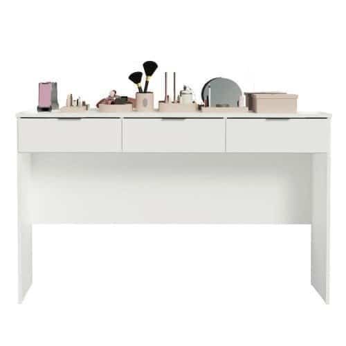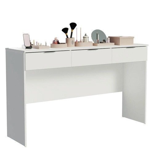 Lembrando o modelo camarim, esta penteadeira é composta por três gavetas com puxadores de alumínio. As dobradiças e corrediças são metálicas e as ferragens de qualidade aumentam a vida útil do móvel. Possui um reforço na parte frontal para melhor sustentação.
