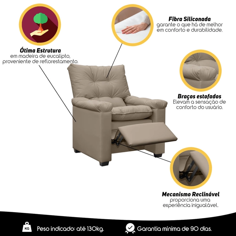 Descubra o conforto supremo da poltrona do papai reclinável Imperador com um toque de luxo e relaxamento. Nossa poltrona é o seu refúgio perfeito após um longo dia de trabalho ou momentos de descontração merecidos. Sinta a sensação única de se acomodar em um assento macio e aconchegante. Além disso o enchimento em fibra siliconada garante uma experiência de descanso única oferecendo suporte ideal para o corpo. Esta poltrona Imperador é o sinônimo de comodidade qualidade e design sofisticado. Saiba mais sobre o produto: