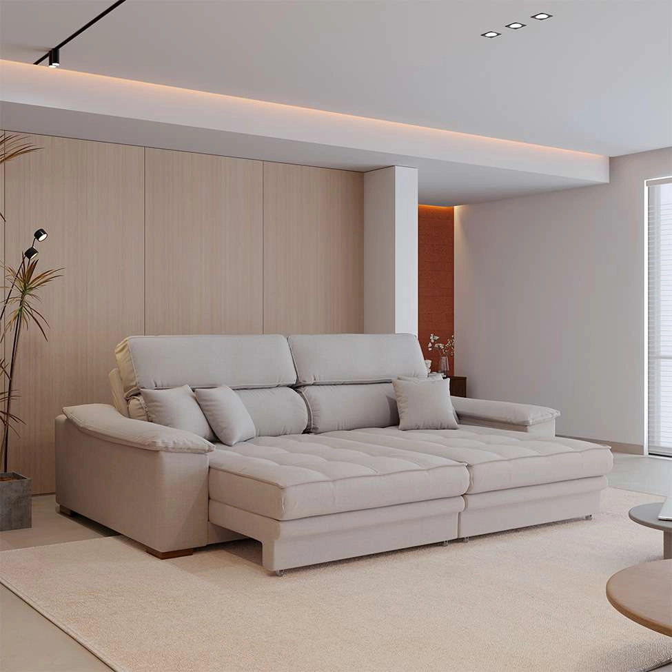 Que tal o Sofá Lupin? Com inúmeras vantagens estruturais e um design de encher os olhos, o Sofá Lupin é a melhor combinação entre comodidade e beleza. O primeiro destaque vai para os rodízios, que deixam a peça facilmente adaptável ao espaço e tornam a reorganização da sala uma tarefa simples. Já a combinação da espuma com ótima densidade + assento retrátil e encosto reclinável oferecem o equilíbrio perfeito para aqueles momentos em que você precisa de um descanso mais completo ou para quando vai receber visitas. Dono de um visual elegante que se integra com harmonia à decoração do cômodo, ele ainda é reforçado pela estrutura em madeira maciça, que agrega boa durabilidade e segurança perfeita à rotina – desse jeito, você sempre pode contar com um cantinho aconchegante e bem mobiliado para passar momentos relaxantes.