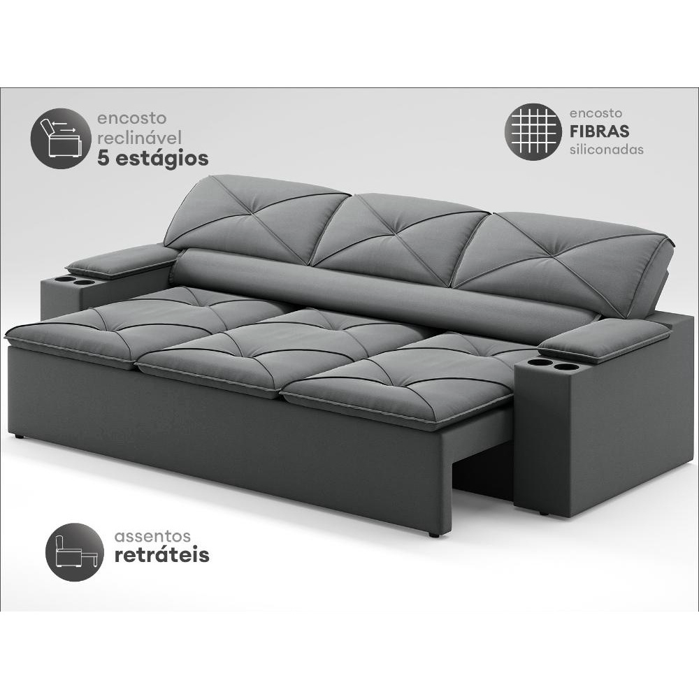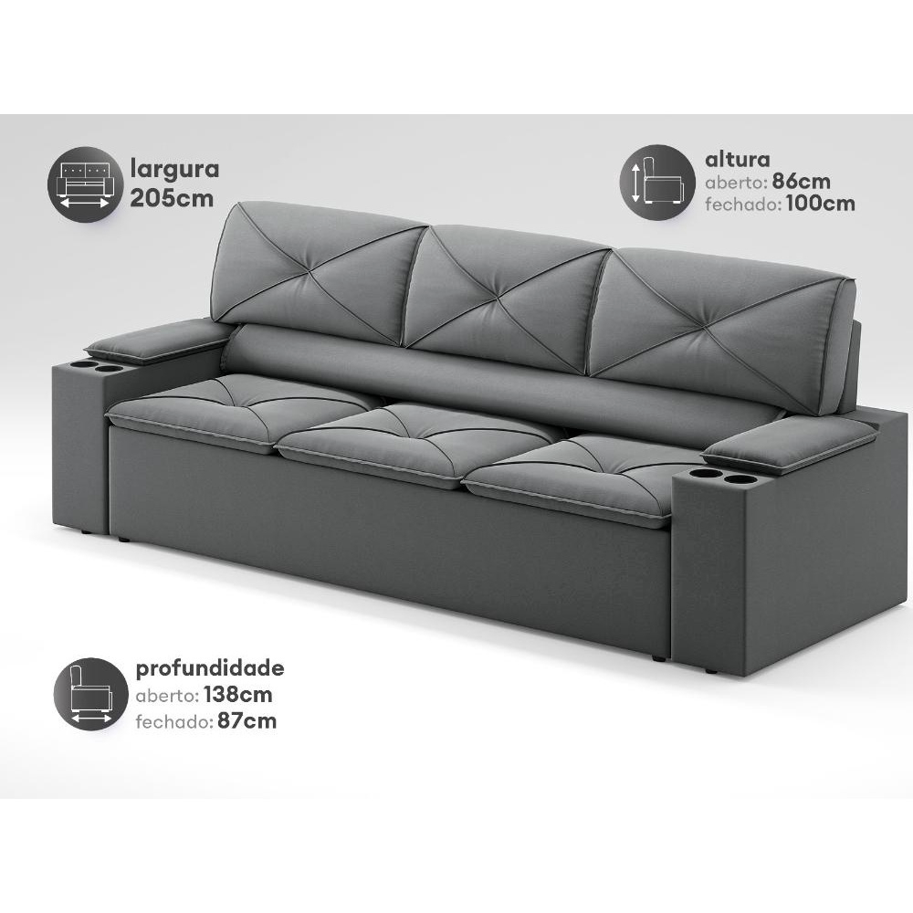 é na sala de estar onde a maior parte dos momentos de lazer da família acontece. Seja curtindo um filminho, jogando aquele lançamento dos games ou recebendo amigos para um café, por isso é essencial ter um sofá para acomodar todos bem. Espaçoso, bem estruturado e com um design para deixar o lar-style perfeito, o modelo pop tem assento retrátil com porta copos nos braços, o que faz dele uma peça ótima para oferecer aquele aconchego extra. Revestido velosuede, sendo ideal para te inspirar e dar aquela mãozinha na hora de criar o ambiente dos sonhos.