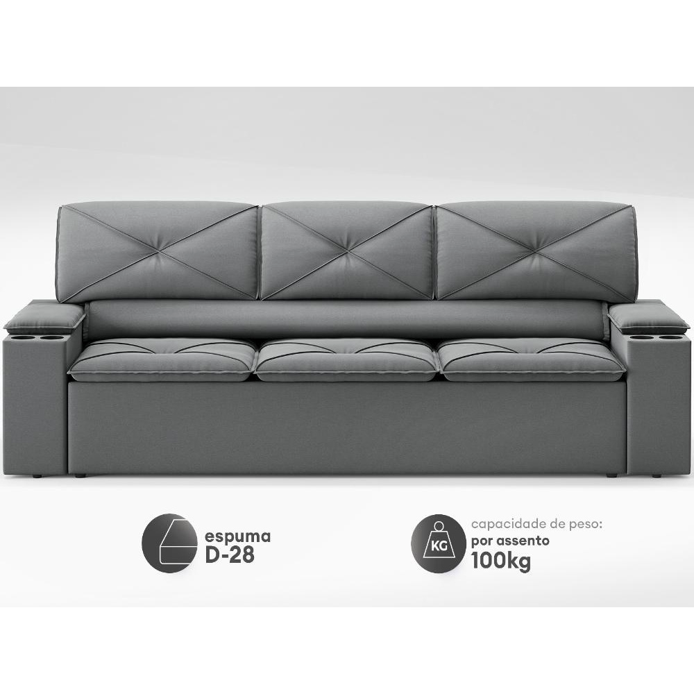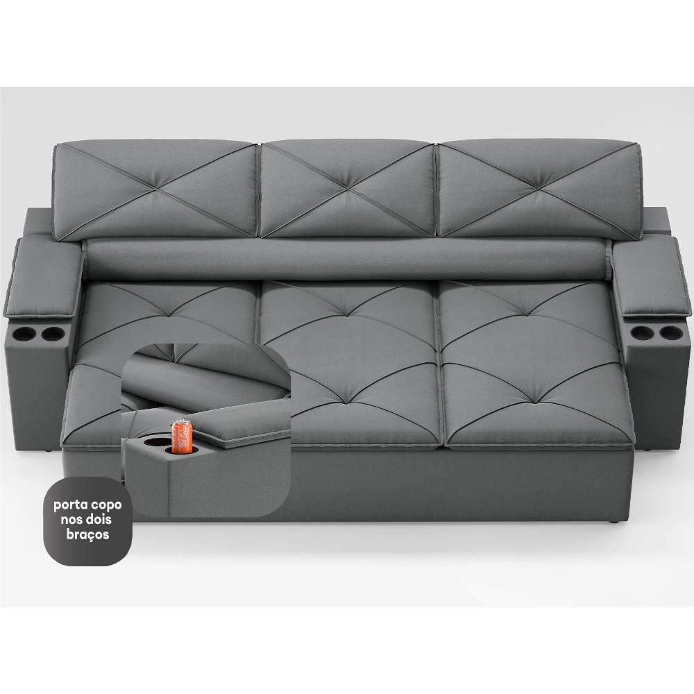 Porta Copos: Sofá possui quatro porta copos fixos (dois em cada braço). As dimensões do porta copo são aproximadamente 10cm x 5cm